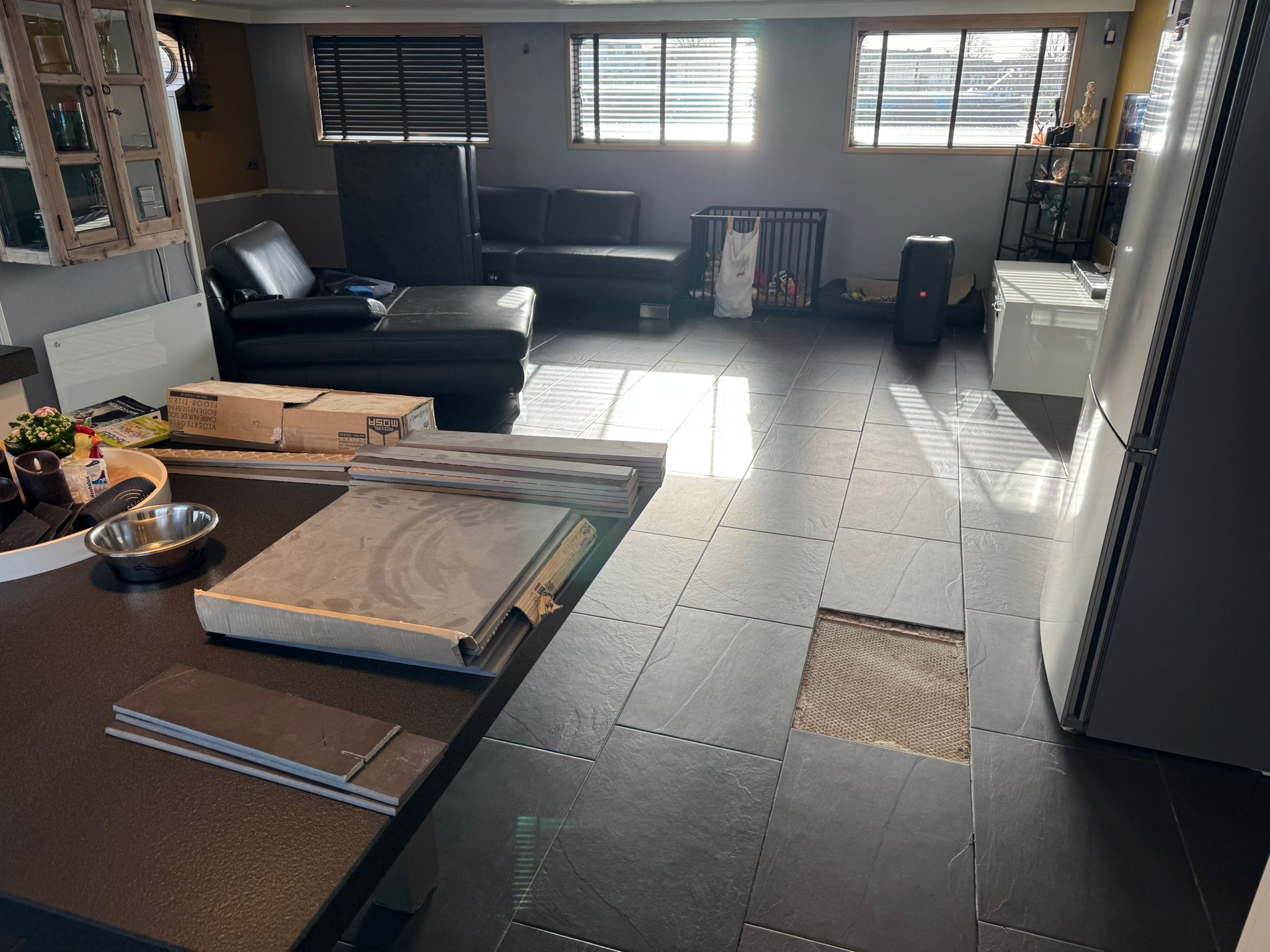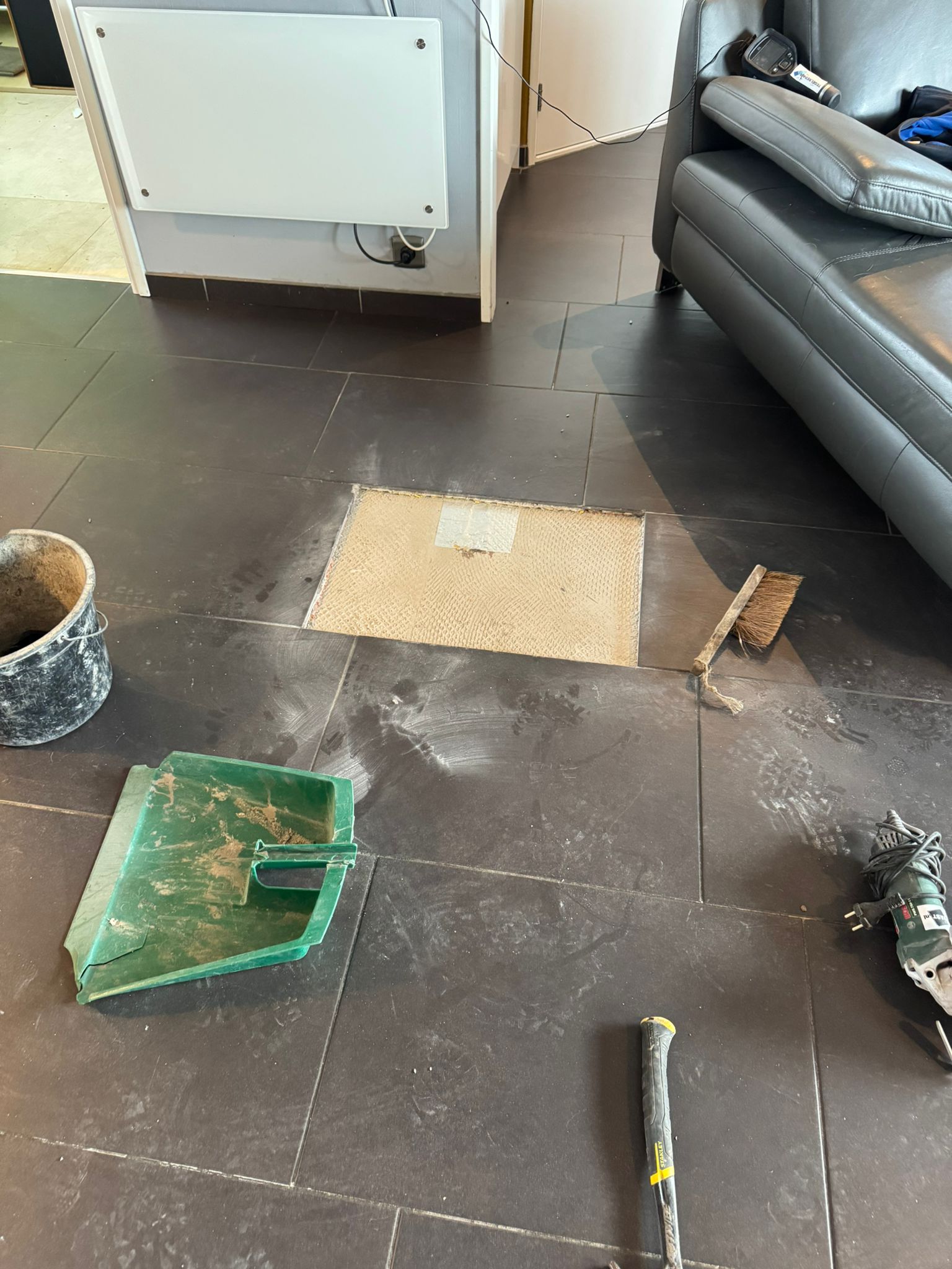De tegelvloeren in de privéruimtes, zoals de woonkamer en keuken, waren op meerdere plekken losgeraakt en deels gebarsten. Wij hebben deze vloeren grondig hersteld en voorzien van nieuw voegwerk, waardoor zowel de uitstraling als de duurzaamheid aanzienlijk zijn verbeterd.